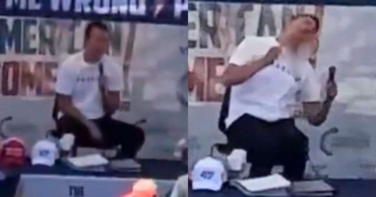 At 7:46 p.m., just as Knox began addressing a question about public trust, he staggered.